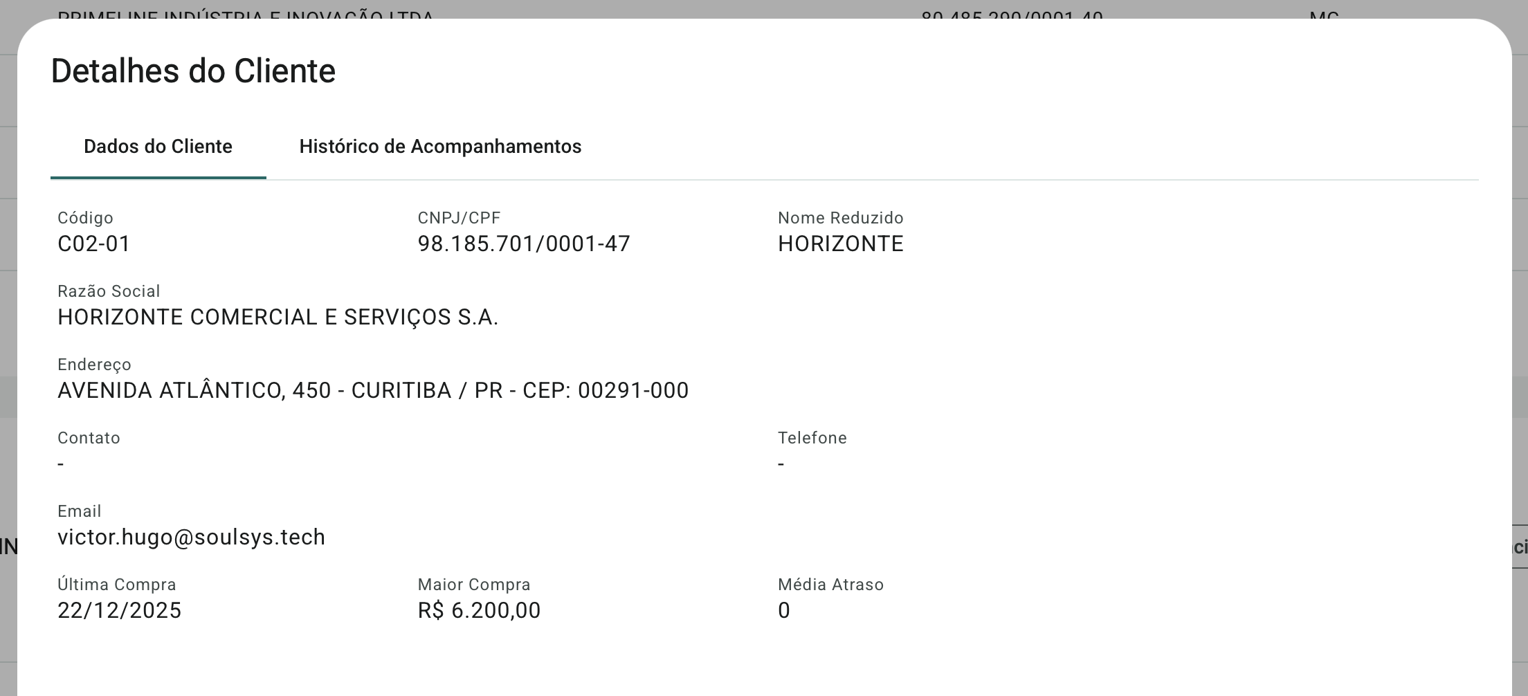 Também é possível visualizar os detalhes de cada cliente diretamente a partir do grid, facilitando a conferência de informações antes do envio dos e-mails.