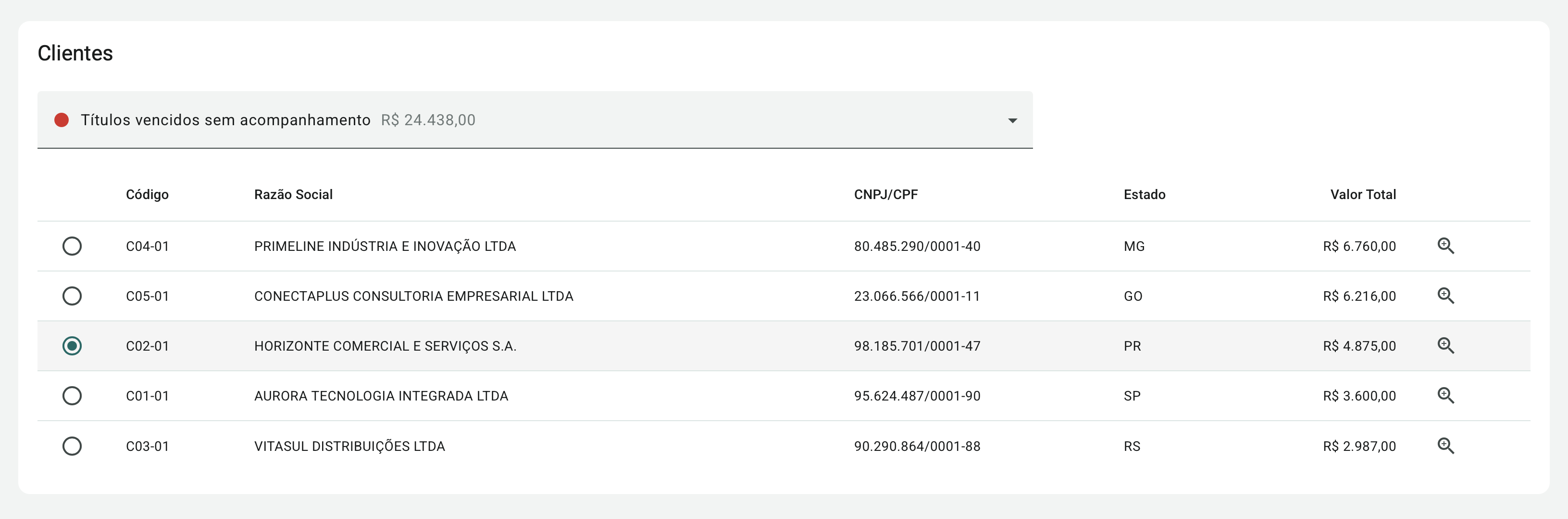 Na seção Clientes é possível visualizar e selecionar clientes com base no status dos seus títulos e acompanhamentos de cobrança. Os clientes são agrupados conforme os seguintes cenários: