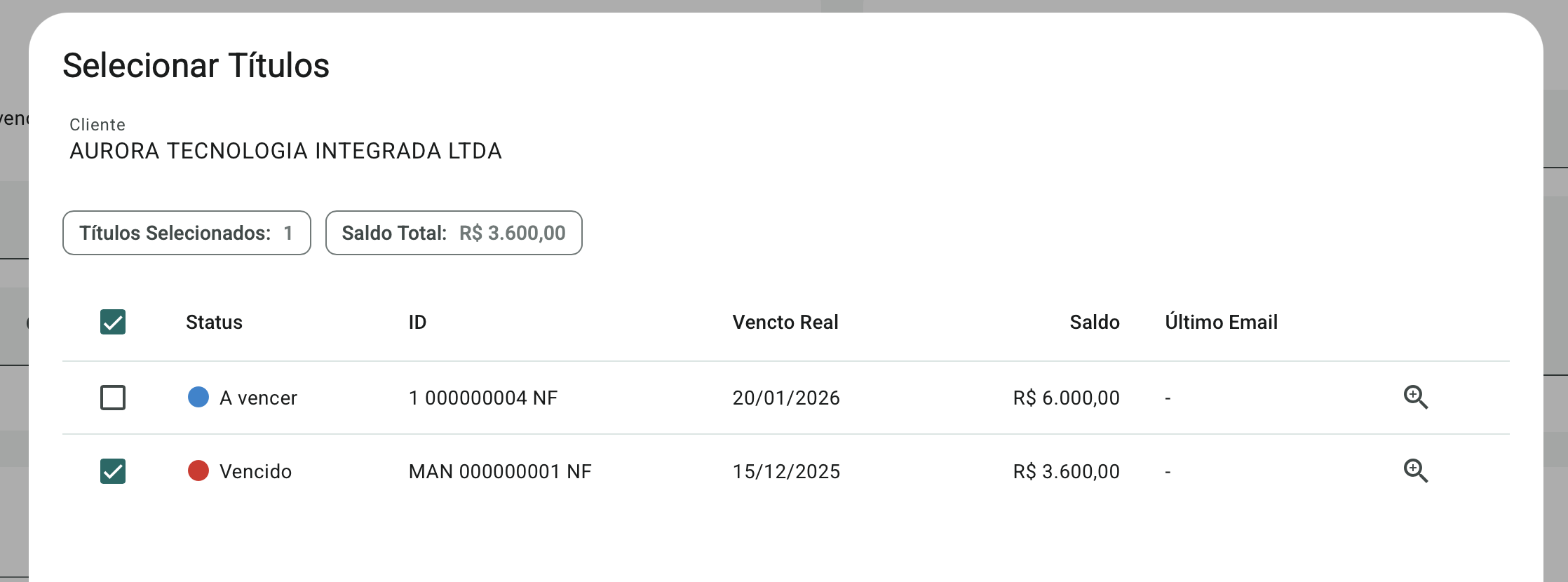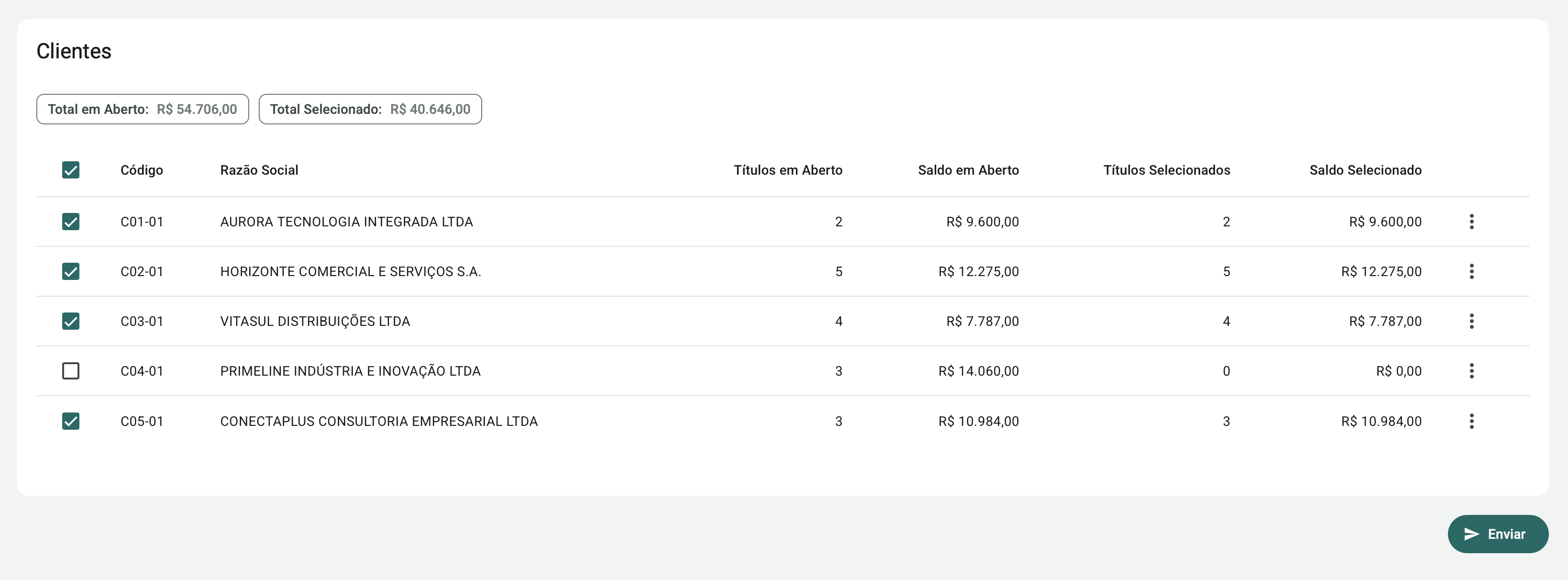 Além de selecionar os clientes, o sistema permite definir exatamente quais títulos serão incluídos no envio. Para isso, utilize a opção Selecionar Títulos, disponível no botão localizado à direita de cada cliente no grid.