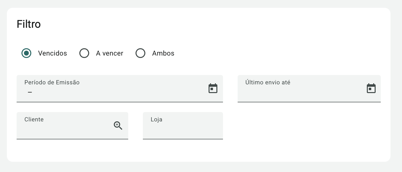 As opções Vencidos, A vencer e Ambos referem-se à data de vencimento dos títulos.