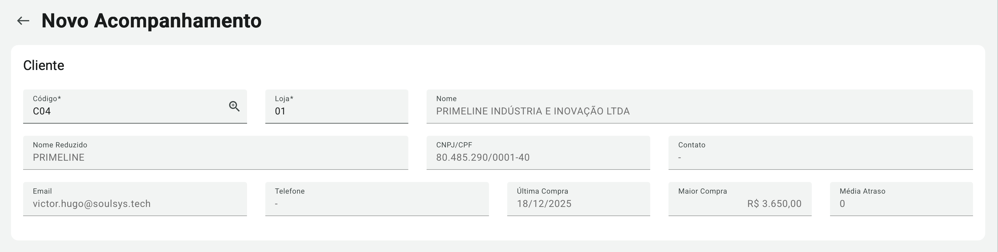 Na seção Cliente, selecione o cliente relacionado ao acompanhamento. Utilize o campo Código para informar o código do cliente no ERP ou clique no ícone de lupa para pesquisar por código, nome ou CPF/CNPJ.