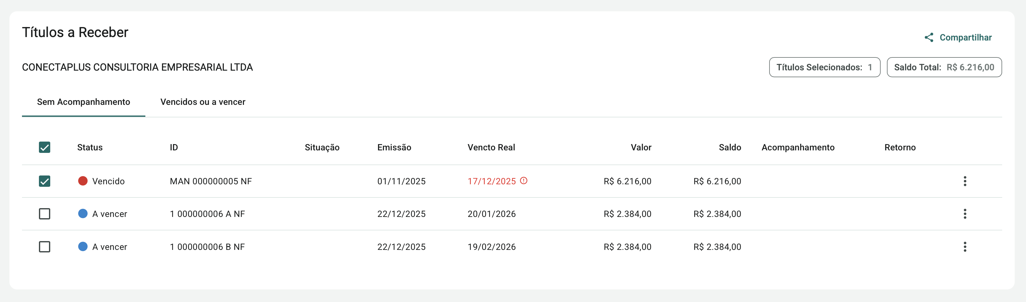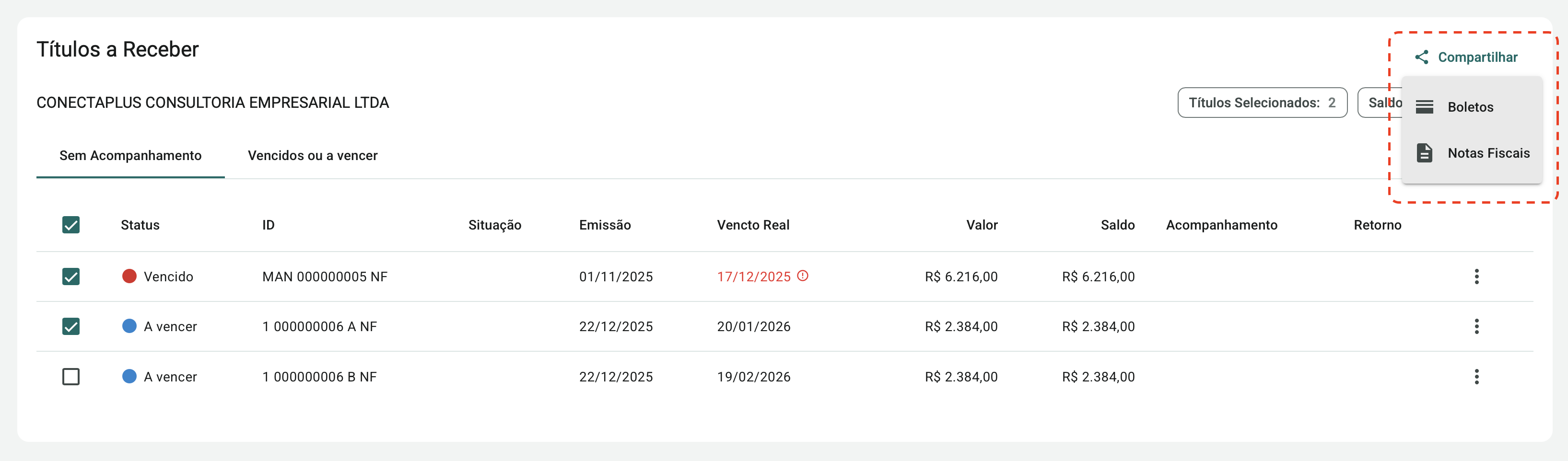 Ao selecionar um ou mais títulos, o sistema habilita o botão Compartilhar, localizado no canto superior direito da seção Títulos a Receber. Essa funcionalidade permite compartilhar boletos bancários ou notas fiscais relacionadas aos títulos do acompanhamento.