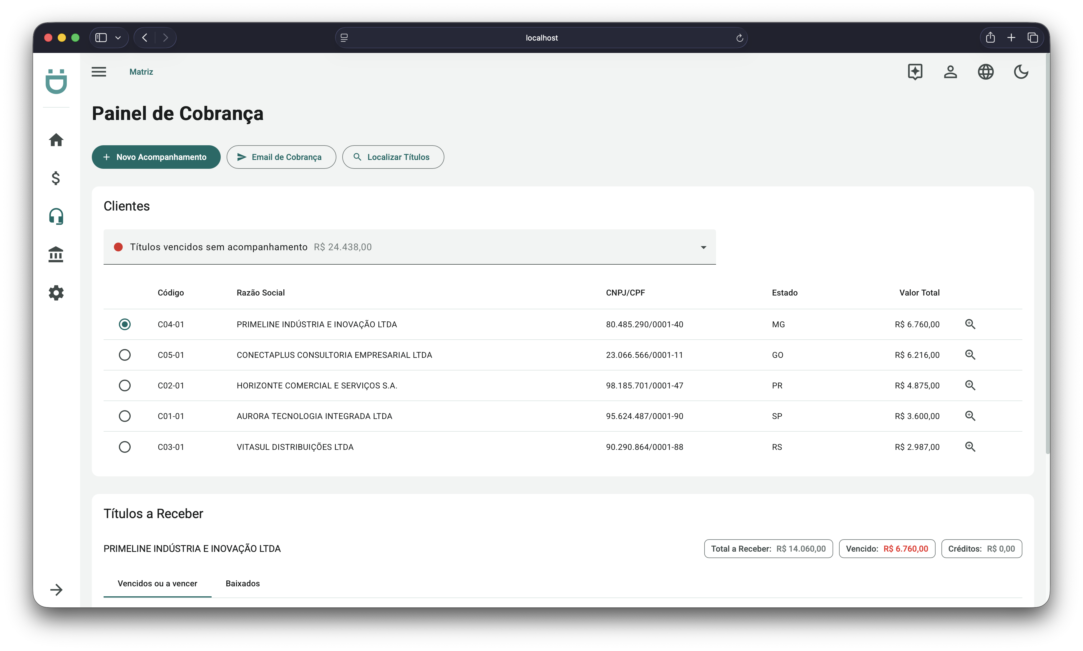- Selecionar Cliente — seleciona automaticamente o cliente do título no painel de cobrança.
