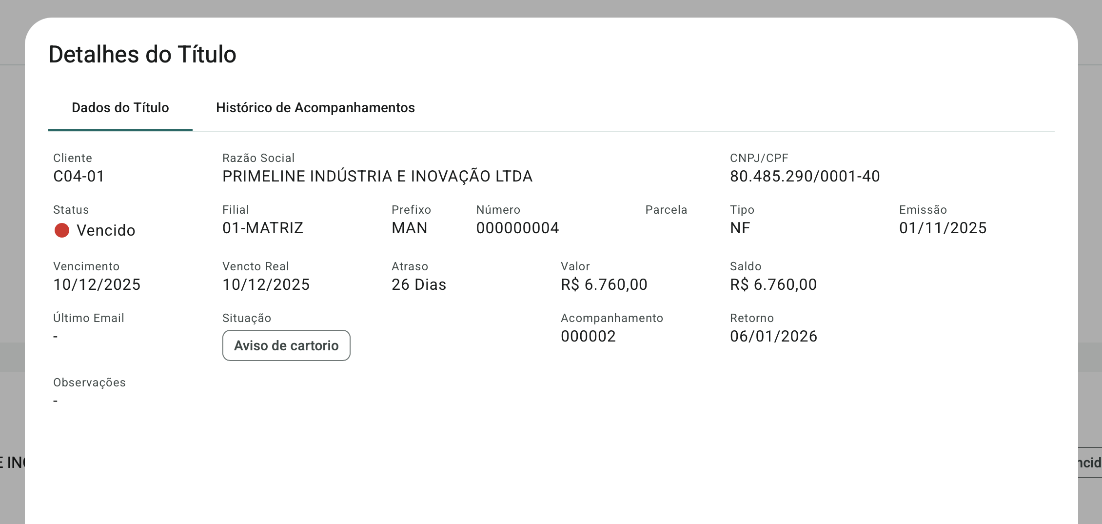 - Novo Acompanhamento — inicia a criação de um novo acompanhamento para o cliente e os títulos selecionados.