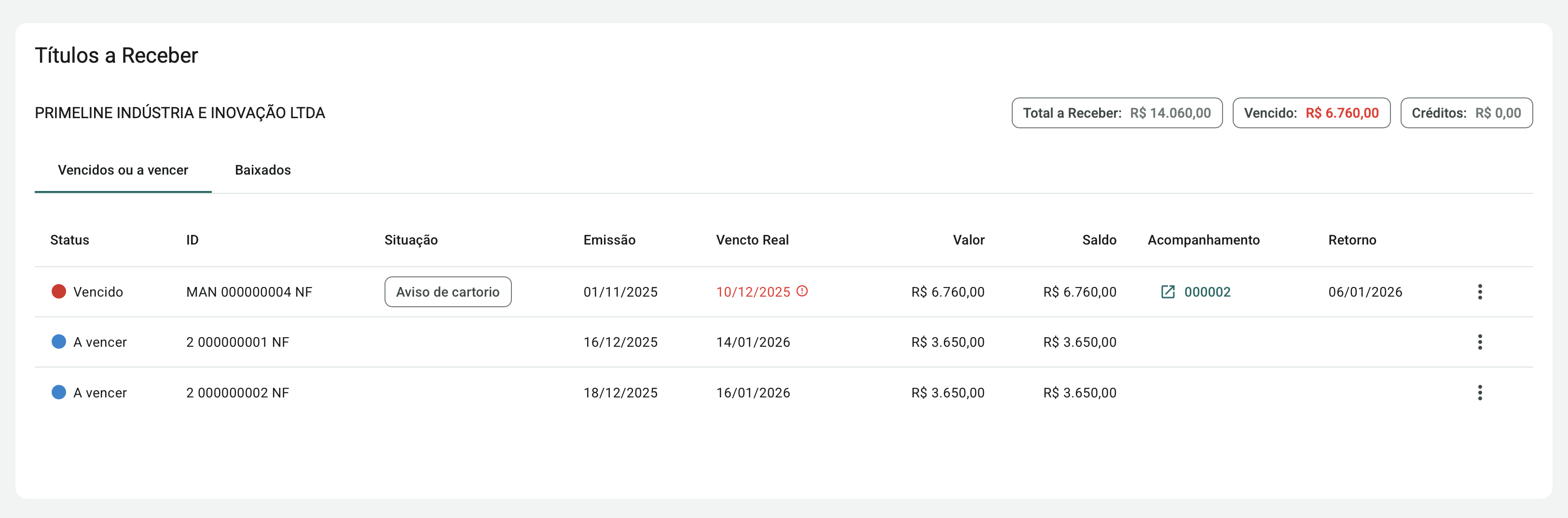 O grid apresenta informações relevantes como Status e Situação do título, além de destacar visualmente os títulos vencidos. Também é possível identificar rapidamente se o título possui acompanhamentos registrados por meio da coluna Acompanhamento.
