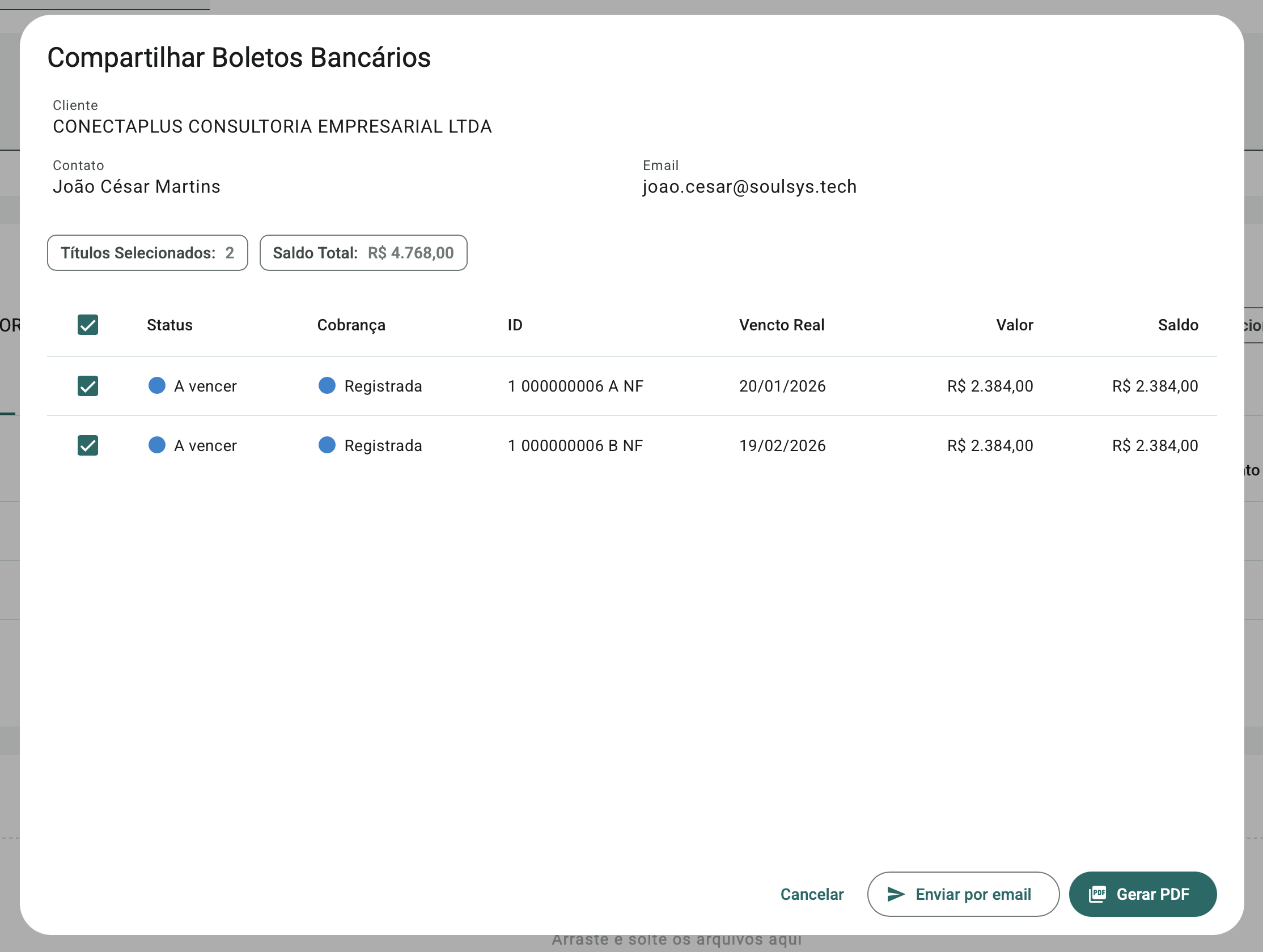 A opção de compartilhamento de boletos bancários permite enviar os boletos dos títulos selecionados diretamente ao contato do acompanhamento. Os boletos podem ser enviados automaticamente por e-mail ou baixados em PDF para envio manual.