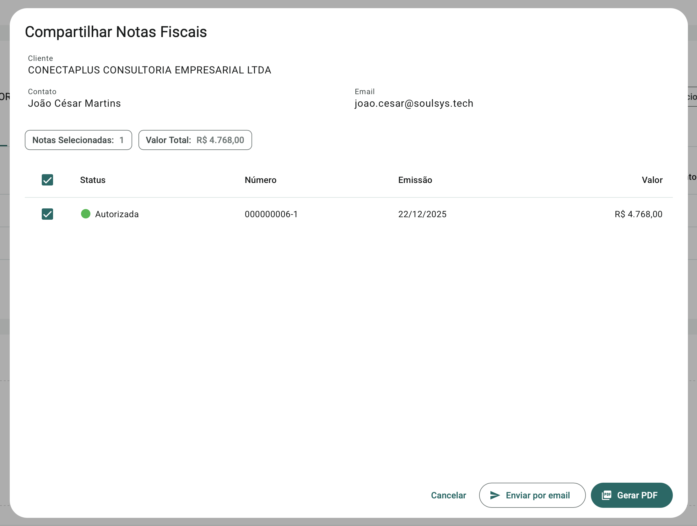 Na opção de compartilhamento de notas fiscais, o usuário pode enviar automaticamente o DANFE de notas fiscais transmitidas e autorizadas para o e-mail do contato selecionado. Também é possível realizar o download do PDF do DANFE para envio manual.
